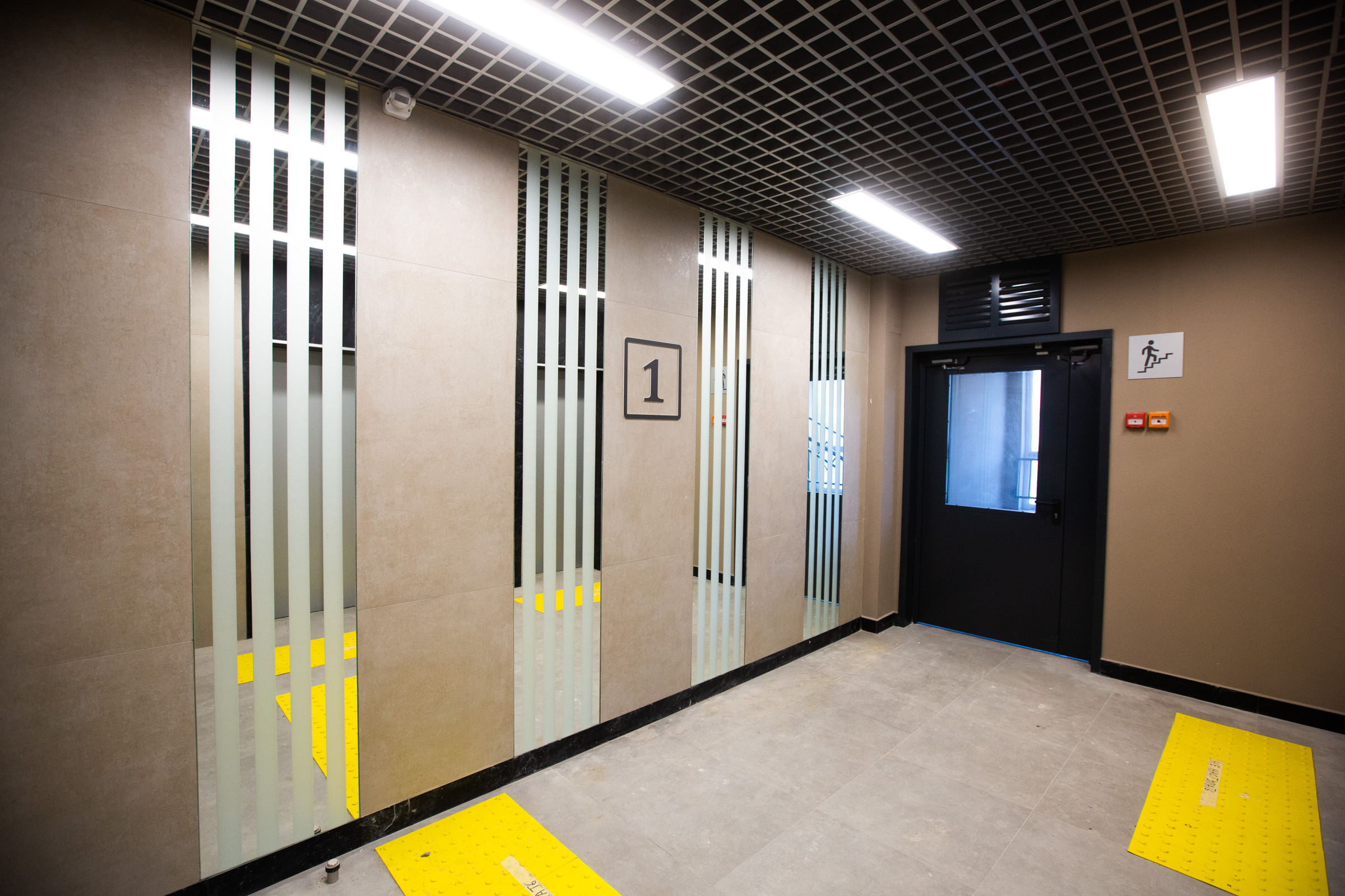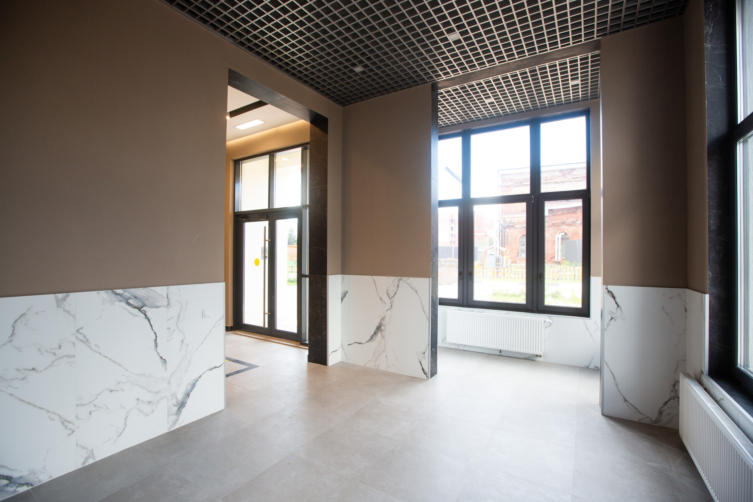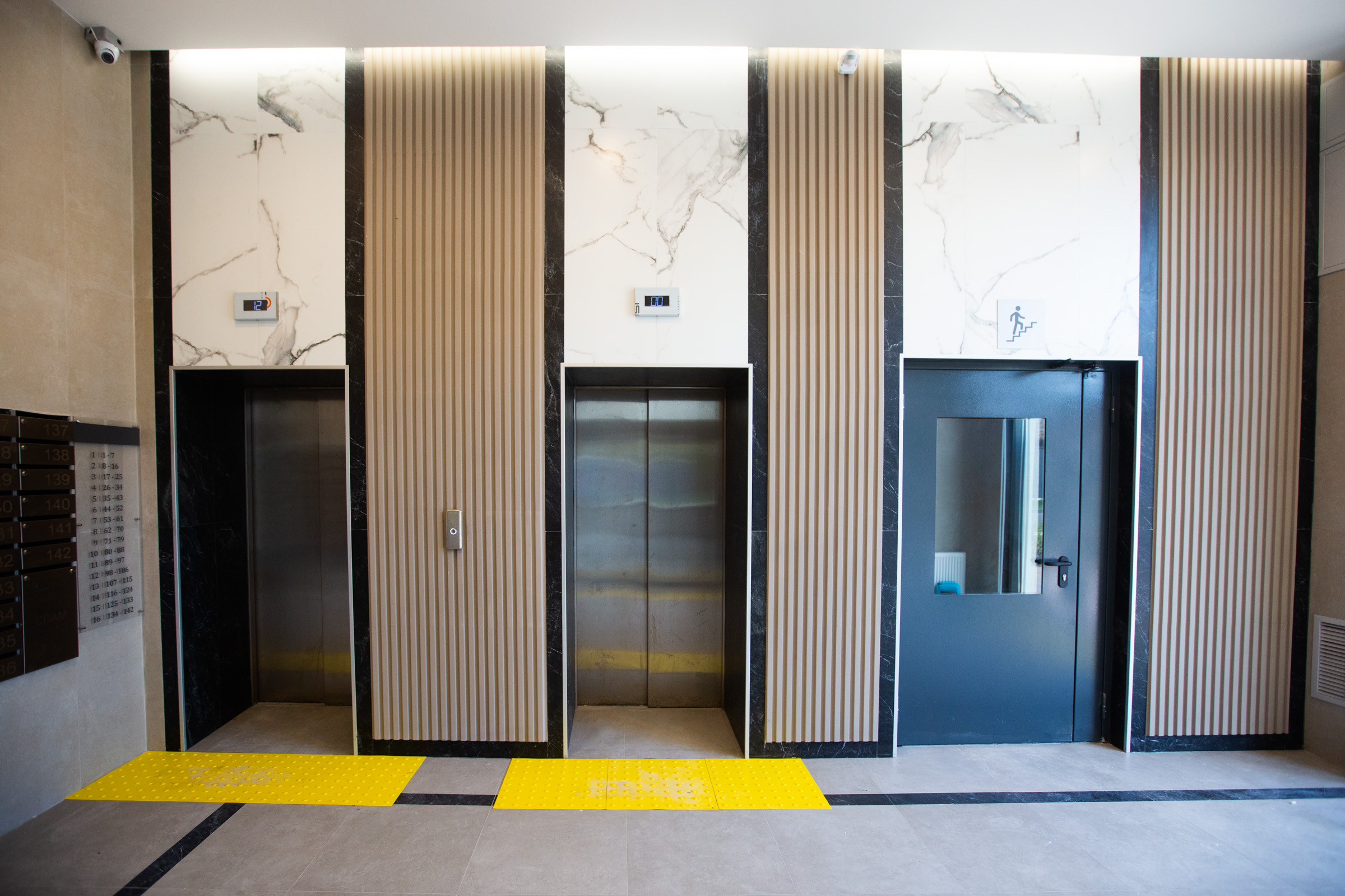 Входная группа, колясочная, лифтовой холл и навигация по всему периметру, выполнена в одной стилистике спокойных и светлых оттенков. Благодаря большим окнам и панорамным дверям при входе поступает много света, отсутствует ощущение сдавленности. Для удобства предусмотрена комфортная зона отдыха и ожидания.