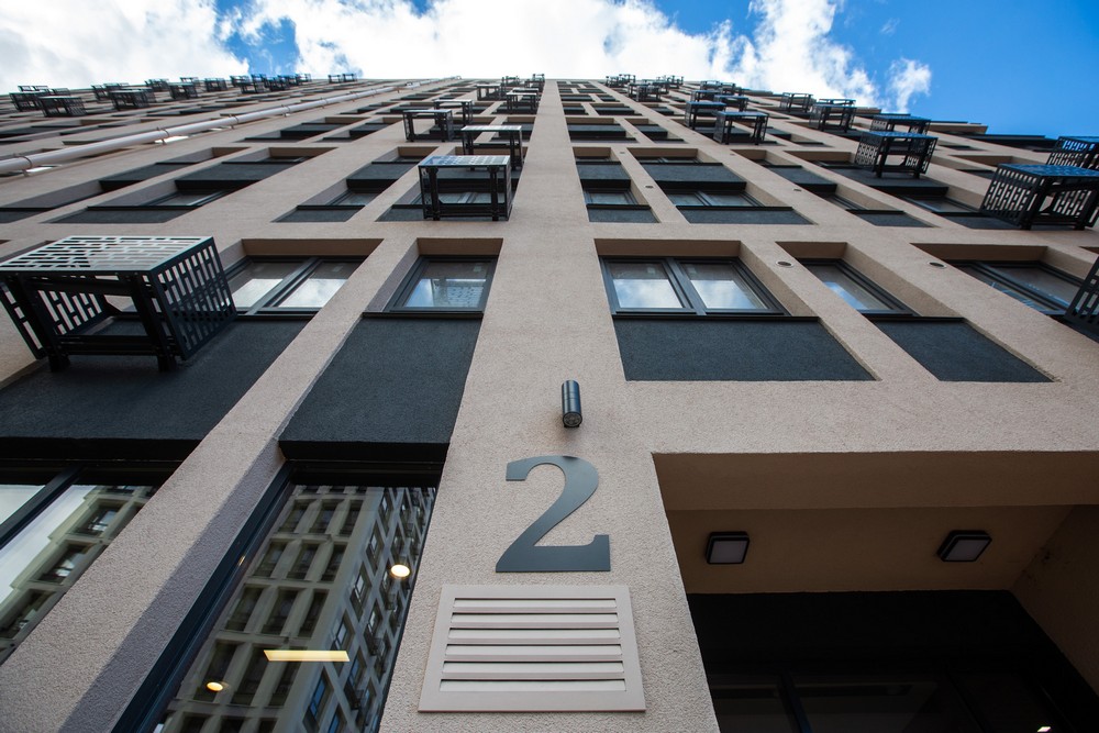 Система двух жилых секций, выполненная в разной стилистике рождает запоминающийся и стильный образ современного проекта. Это креативный дуэт, настроенный на одну волну с любимым городом. Трапециевидная секция устремленная вверх дает ощущение легкости, а закругленная – безграничной свободы. Благодаря такому проектировочному решению планировка квартиры в зависимости от этажа, имеет различие по своей площади и возможность разнообразия функциональных решений внутри.