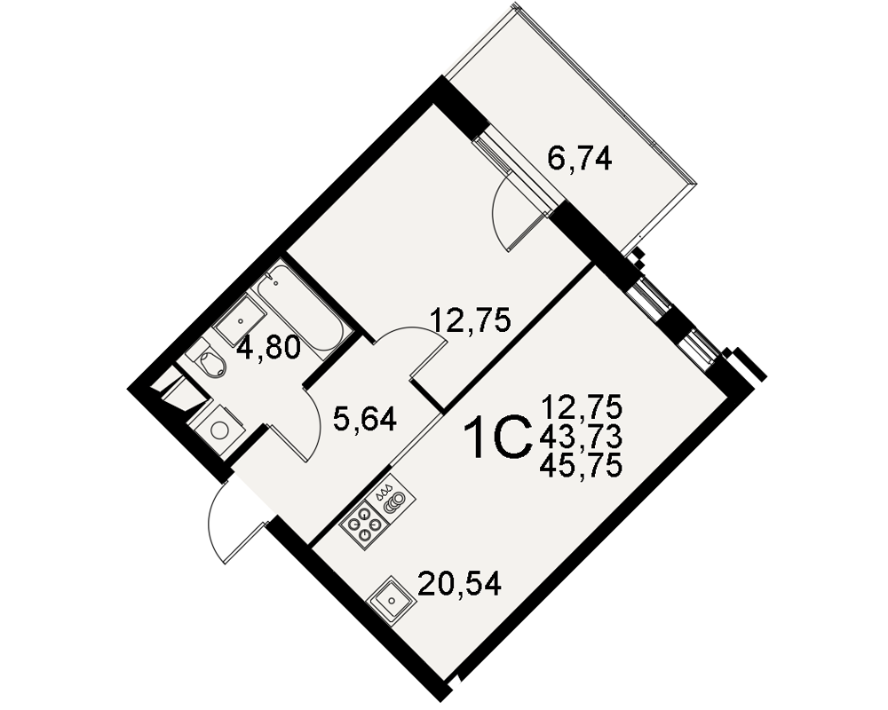 | Площади (общая / жилая / кухня) | 43.73 / 12.75 / 20.54 м2 |