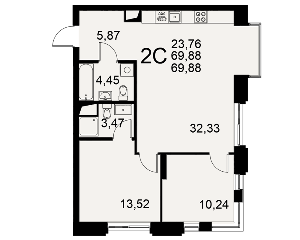 | Площади (общая / жилая / кухня) | 69.88 / 23.76 / 32.33 м2 |