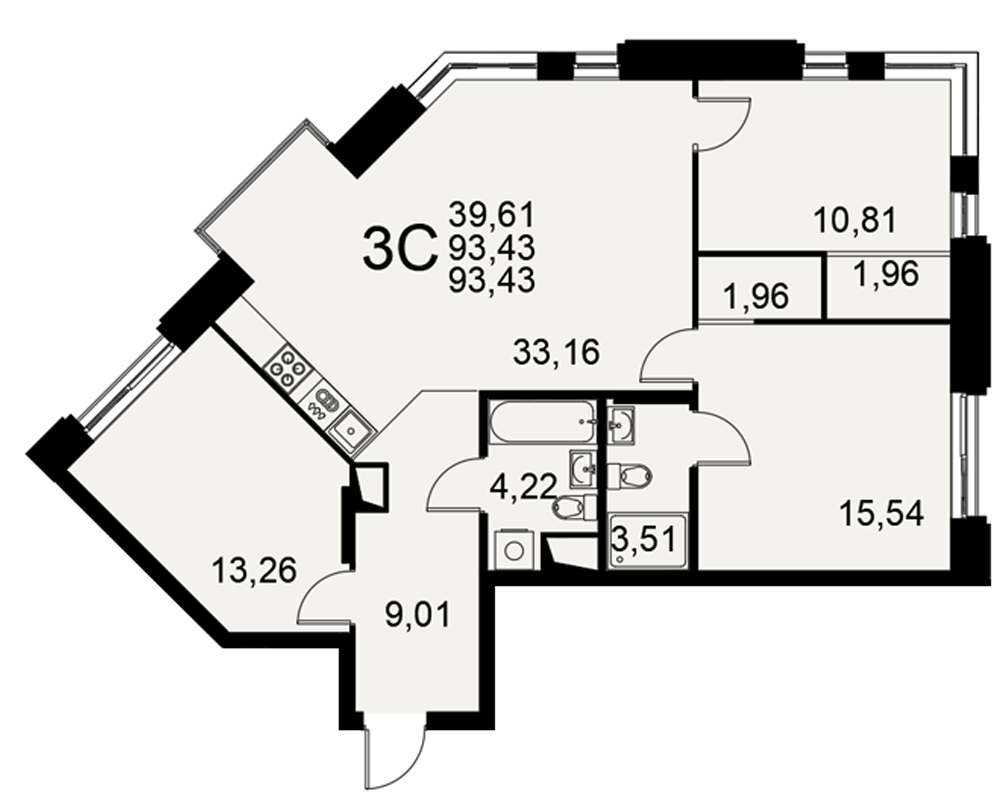 | Площади (общая / жилая / кухня) | 93.43 / 39.61 / 33.16 м2 |