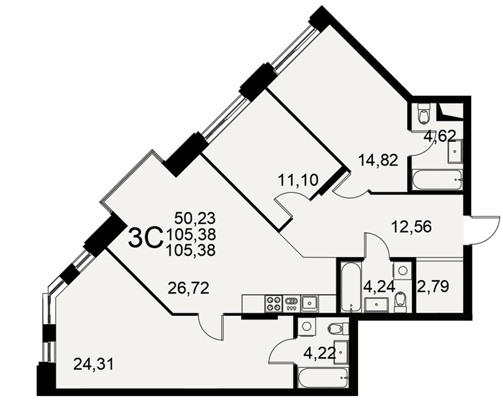 | Площади (общая / жилая / кухня) | 105.38 / 50.23 / 26.72 м2 |