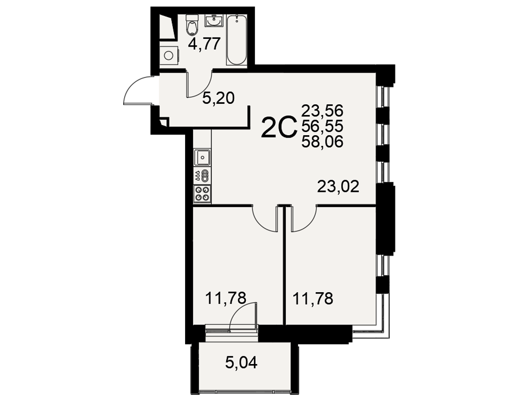 | Площади (общая / жилая / кухня) | 56.55 / 23.56 / 23.02 м2 |