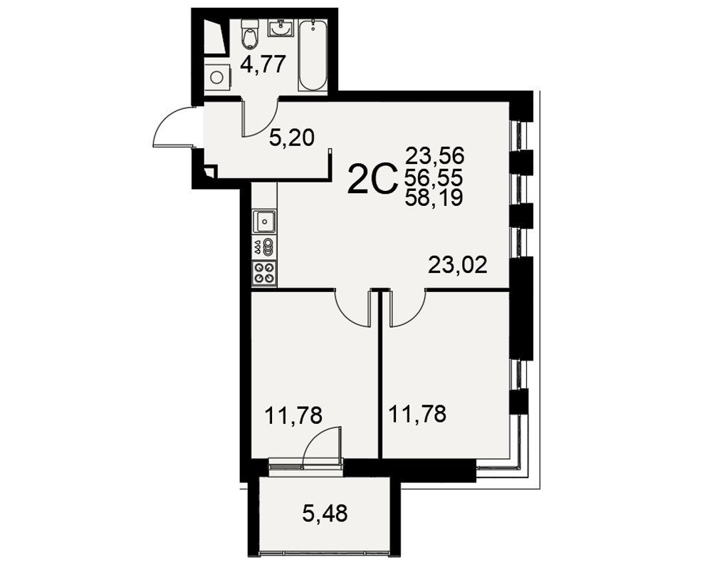 | Площади (общая / жилая / кухня) | 56.55 / 23.56 / 23.02 м2 |