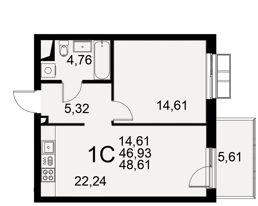 | Площади (общая / жилая / кухня) | 46.93 / 14.61 / 22.24 м2 |