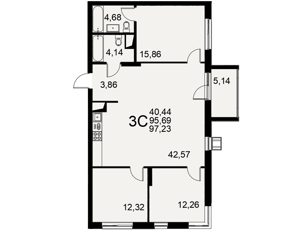 | Площади (общая / жилая / кухня) | 95.69 / 40.44 / 42.57 м2 |