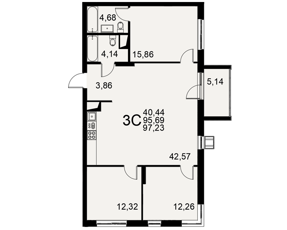 | Площади (общая / жилая / кухня) | 95.69 / 40.44 / 42.57 м2 |