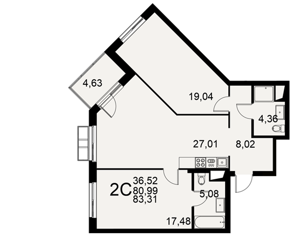 | Площади (общая / жилая / кухня) | 80.99 / 36.52 / 27.01 м2 |