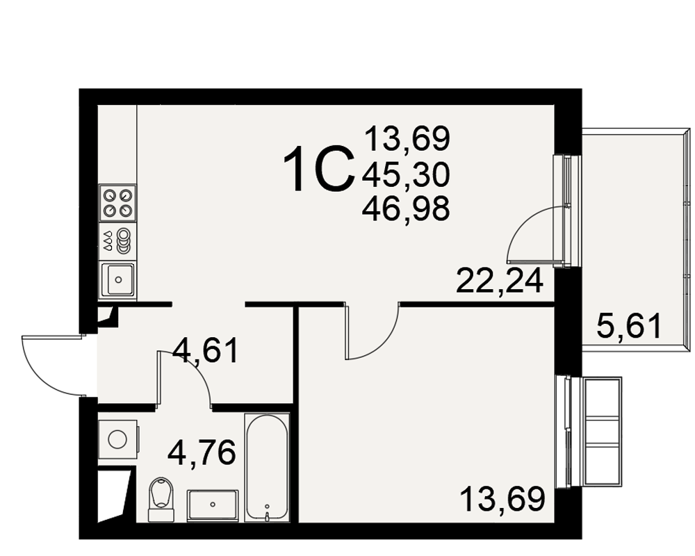 | Площади (общая / жилая / кухня) | 45.30 / 13.69 / 22.24 м2 |