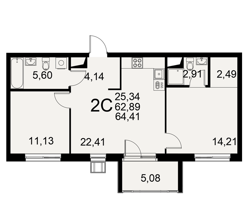 | Площади (общая / жилая / кухня) | 62.89 / 25.34 / 22.41 м2 |