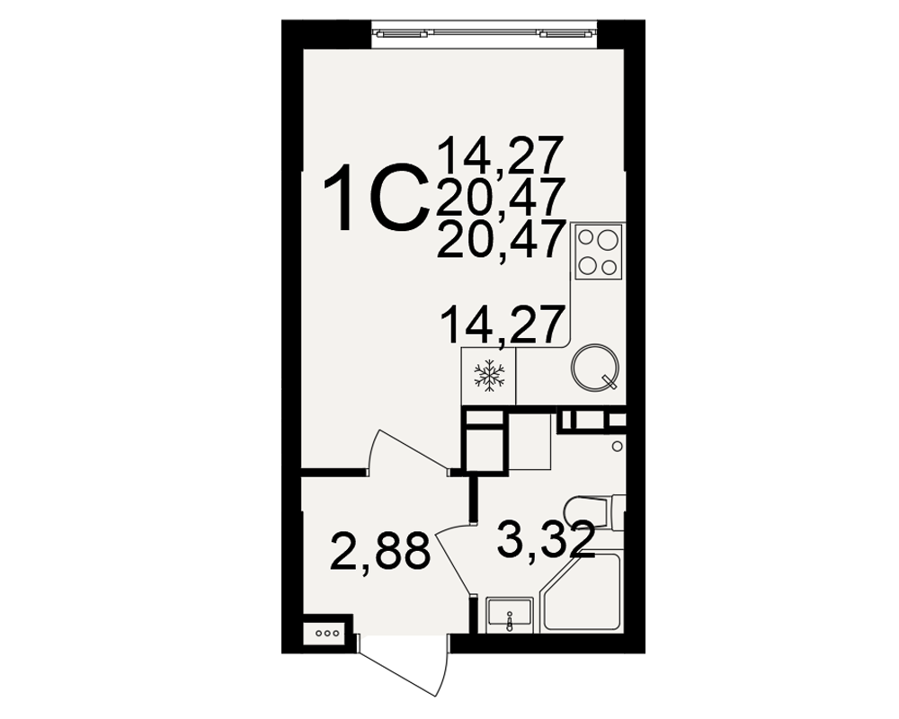 | Площади (общая / жилая / кухня) | 20.47 / 14.27 / м2 |